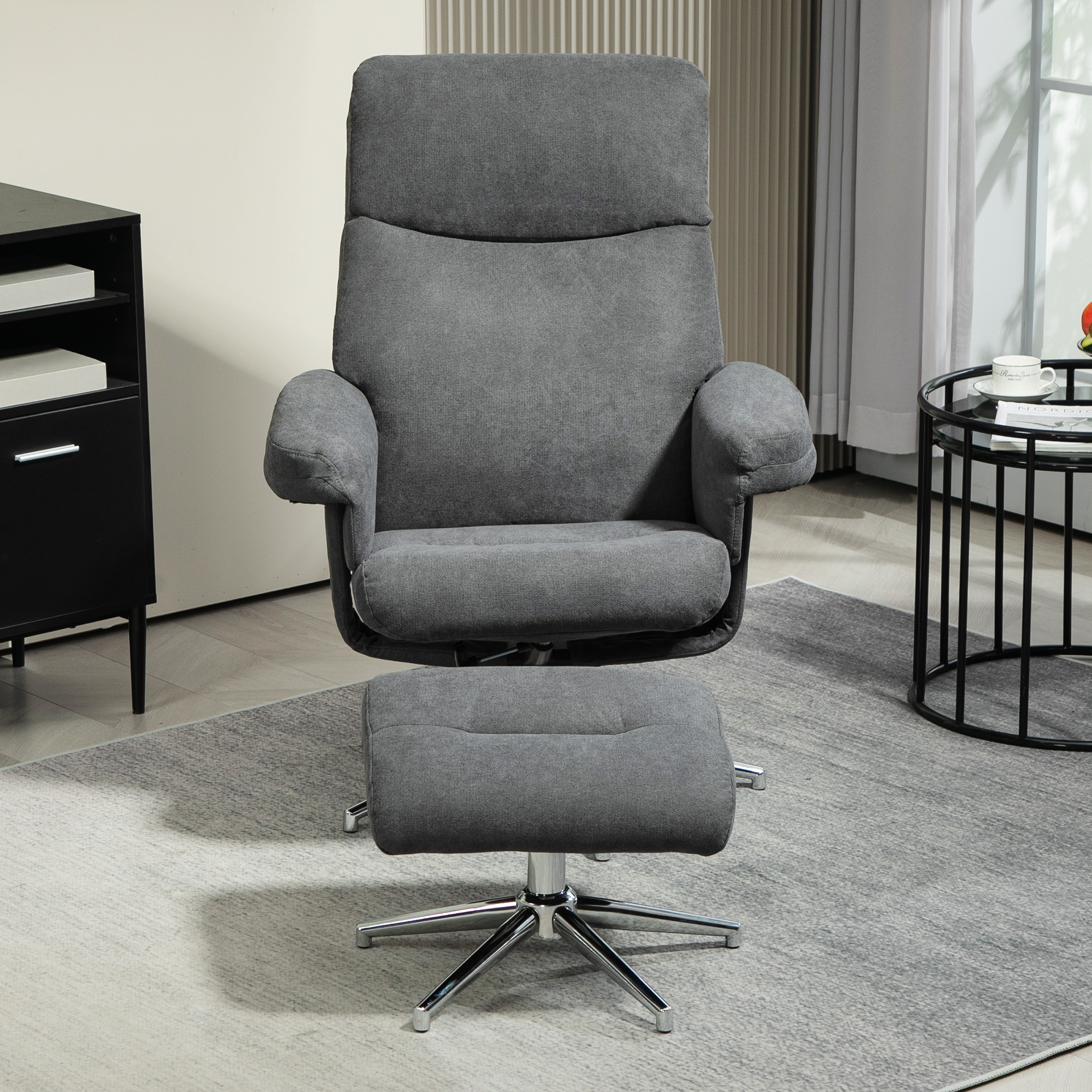 Sink into comfort, anytime, with this HOMCOM recliner chair and footstool set. Adjust the chair back to a maximum 130° angle, to allow you to find your comfort. Pair it with the footstool to elevate and relax your whole body. Both the armchair with footstool have a wooden frame and are fitted with a metal base, so you'll be supported properly; finished with anti-slip foot pads.