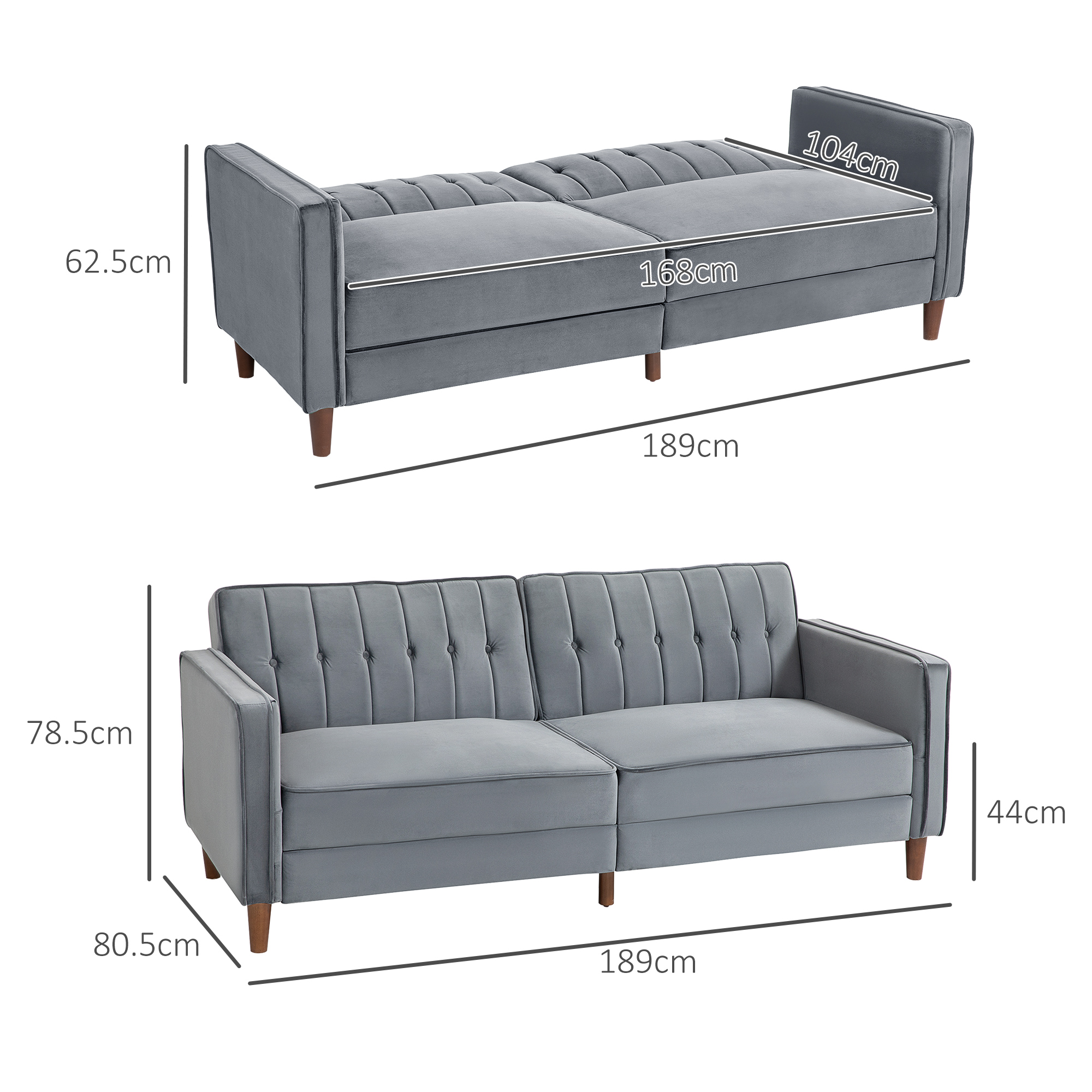 - Overall Dimensions: 189W x 80. 5D x 78. 5Hcm (sofa), 189W x 104D x 62. 5Hcm (bed)