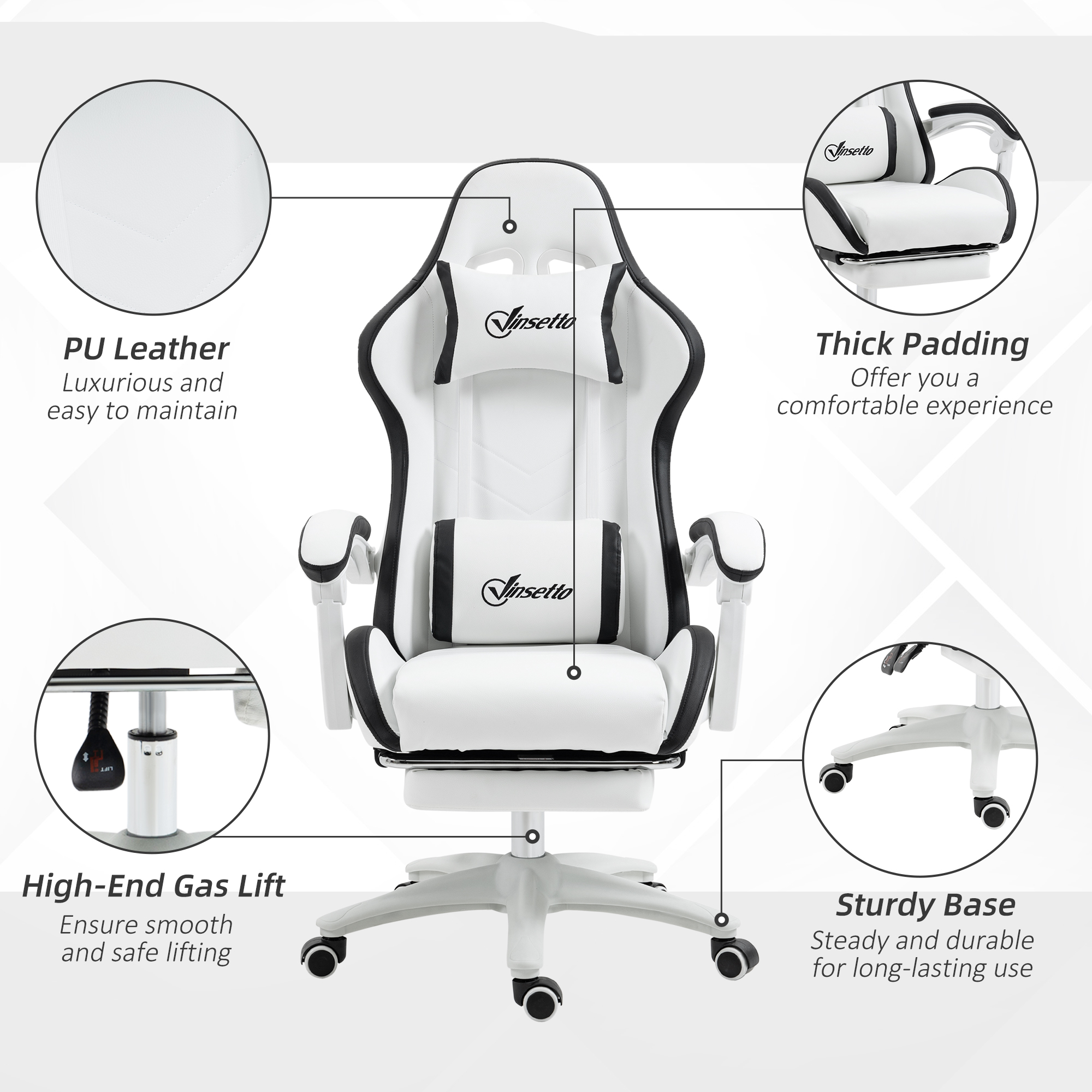 Keep comfortable and focused in the game: do it with this Vinsetto gaming chair. Faux leather upholstery is sleek, with a coloured border all over for a touch of impact. Padded all over, with head and lumbar pillow included for comfort. The back reclines to a maximum 135°, with a pull-out footrest to elevate the lower body. Adjust the height between 45. 5cm and 53. 5cm, to game at a position best for you.