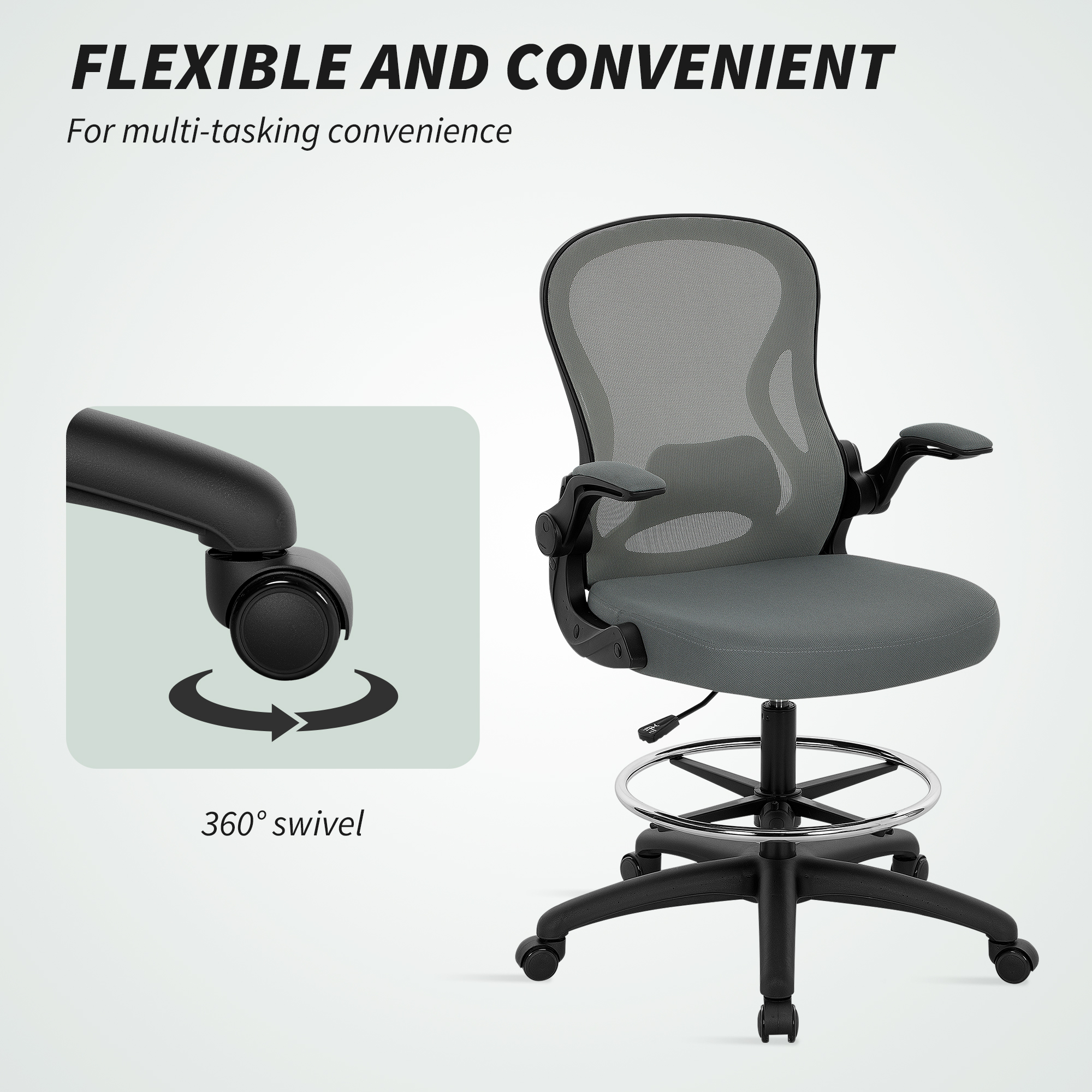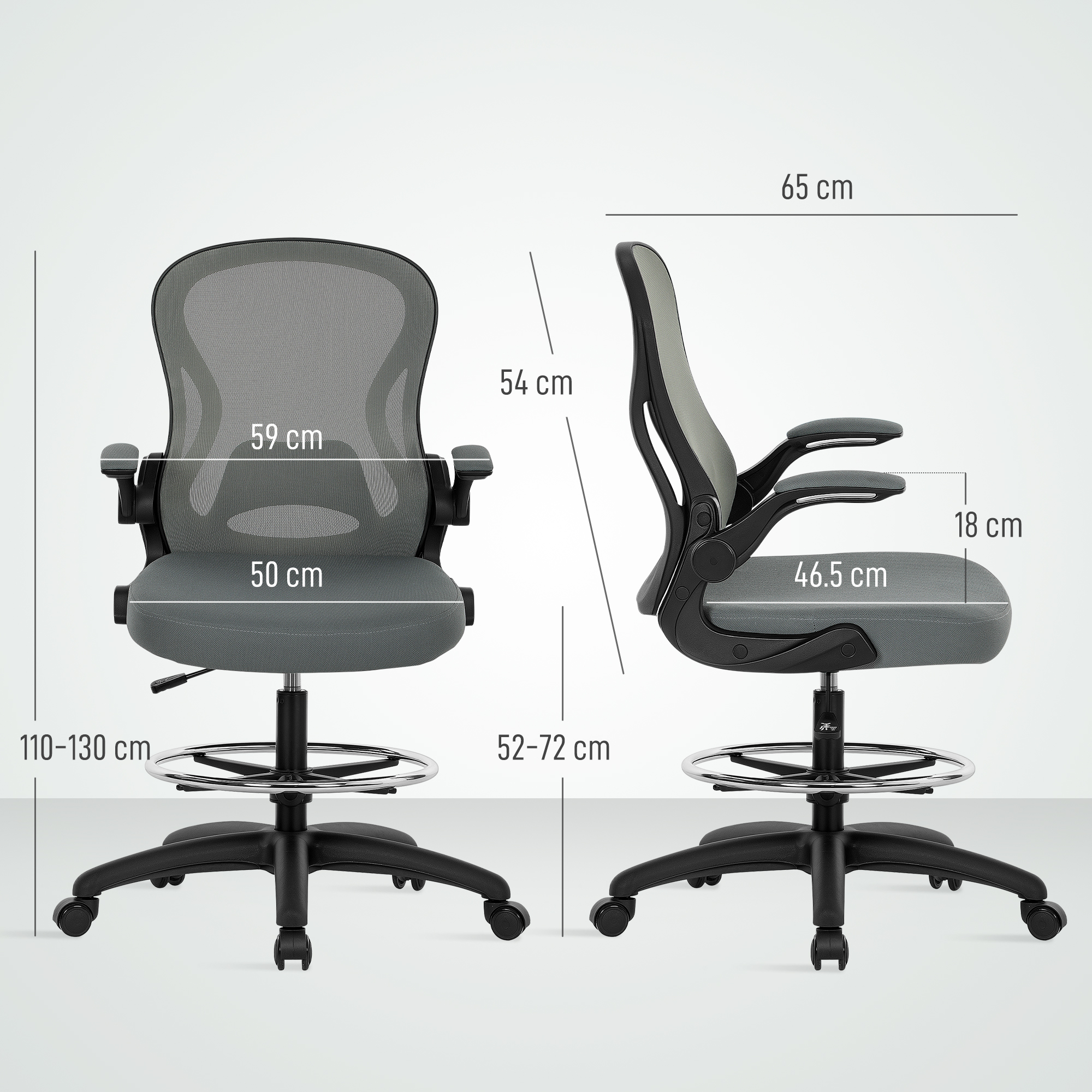 This mesh office chair, from Vinseto, comes in a draughtsman design - great for working at higher levels. Adjust the height between 52-72 cm easily, thanks to the under-seat lever. The padded seat, curved mesh back, flip-up arms and five-wheeled base make it a pleasure to sit on and use, supporting you as you work. Adjust the bottom bar to rest your lower body comfortably. Tall surfaces? No problem!
