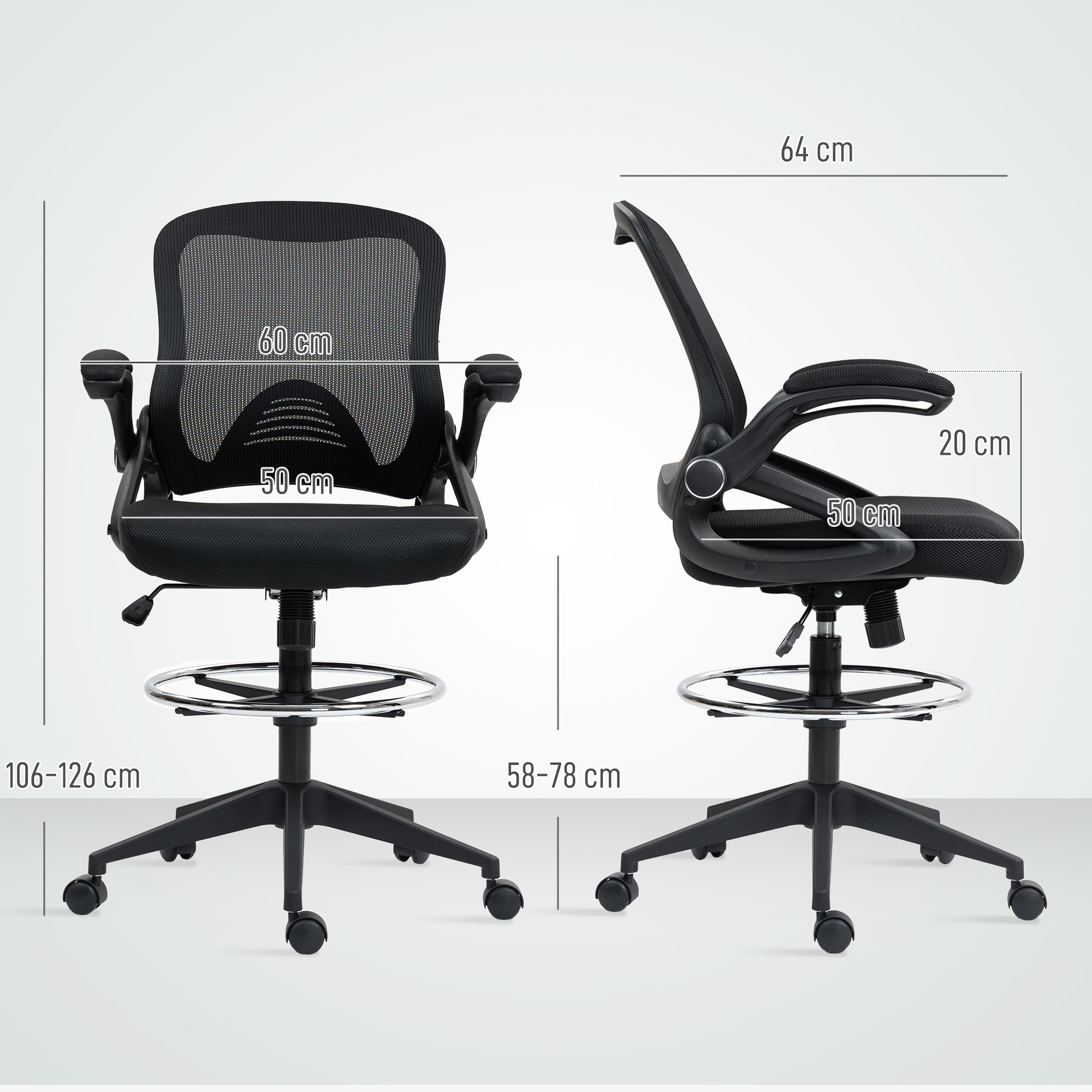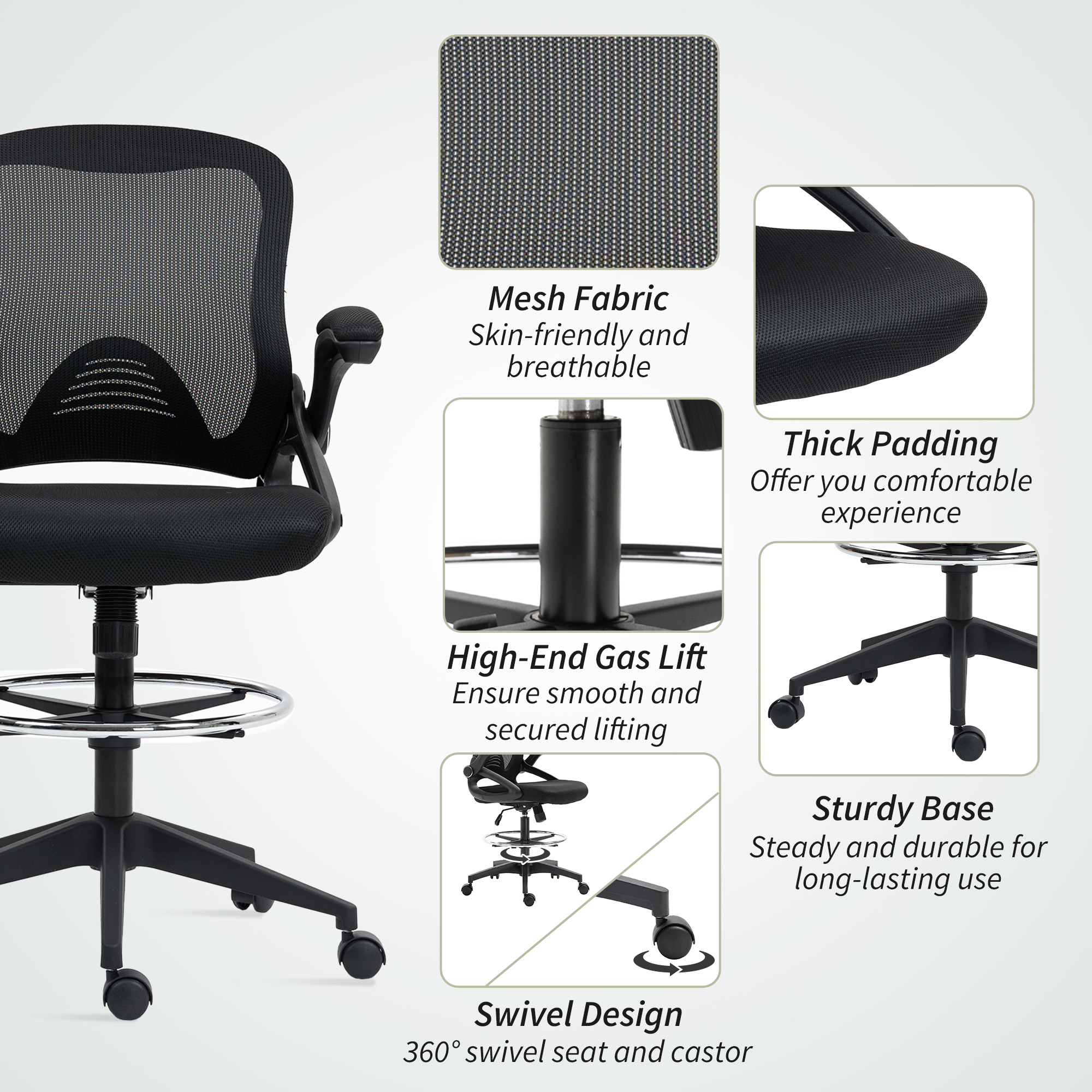 A quality chair must be comfortable even after sitting for long periods. The comfort of this Vinsetto draughtsman chair is achieved through breathable mesh material for the back, solid base casters and a fully adjustable chair body. The mesh chair's seat, armrest and footrest height are designed to fit your sitting style and ensure productivity. Make the most out of your office time with this drafting office chair from Vinsetto.