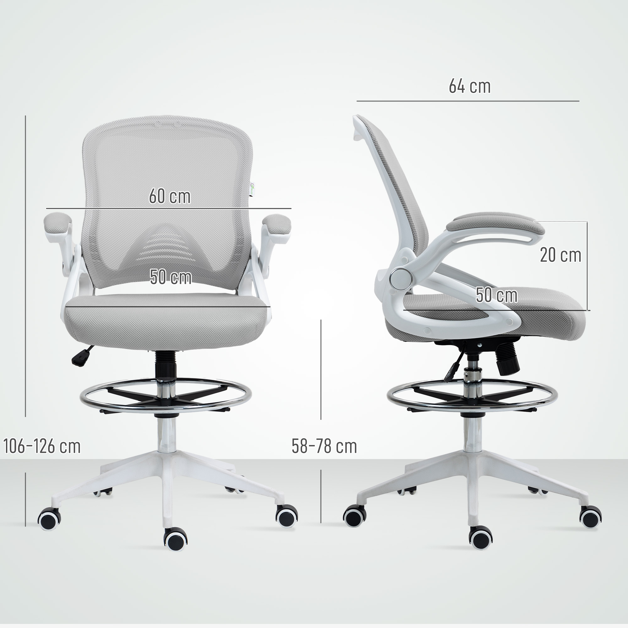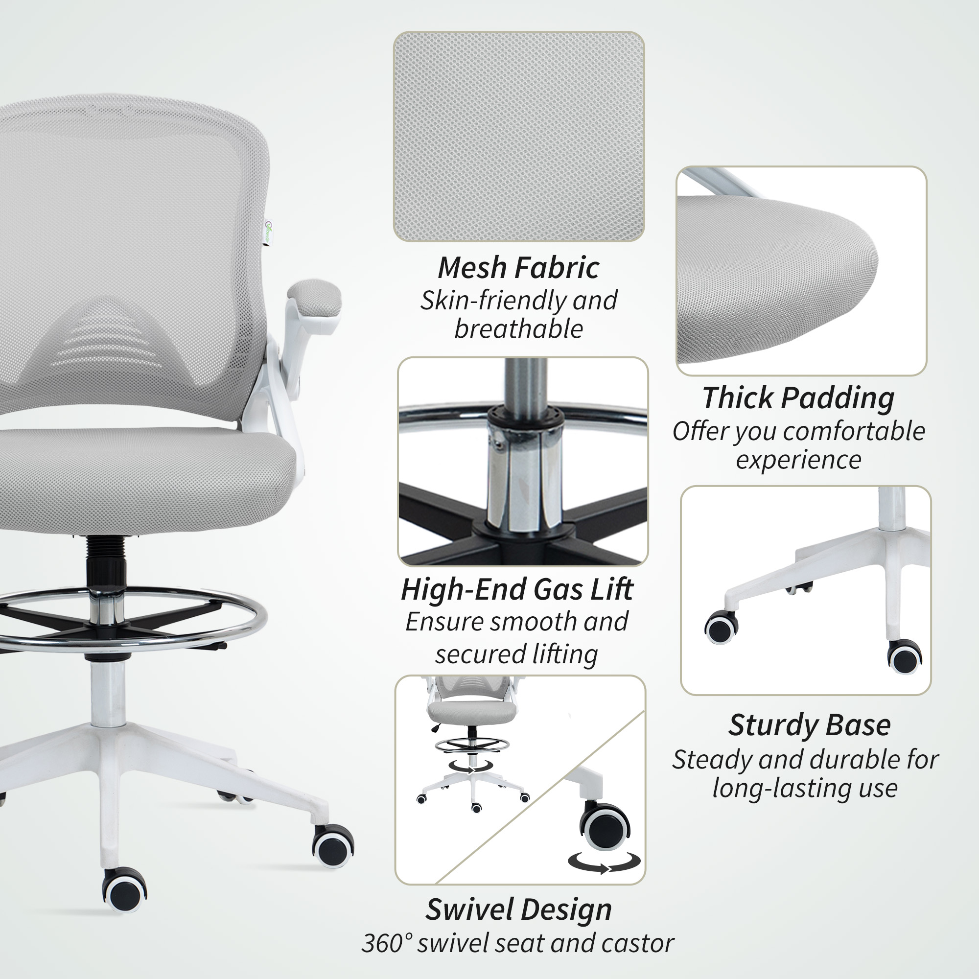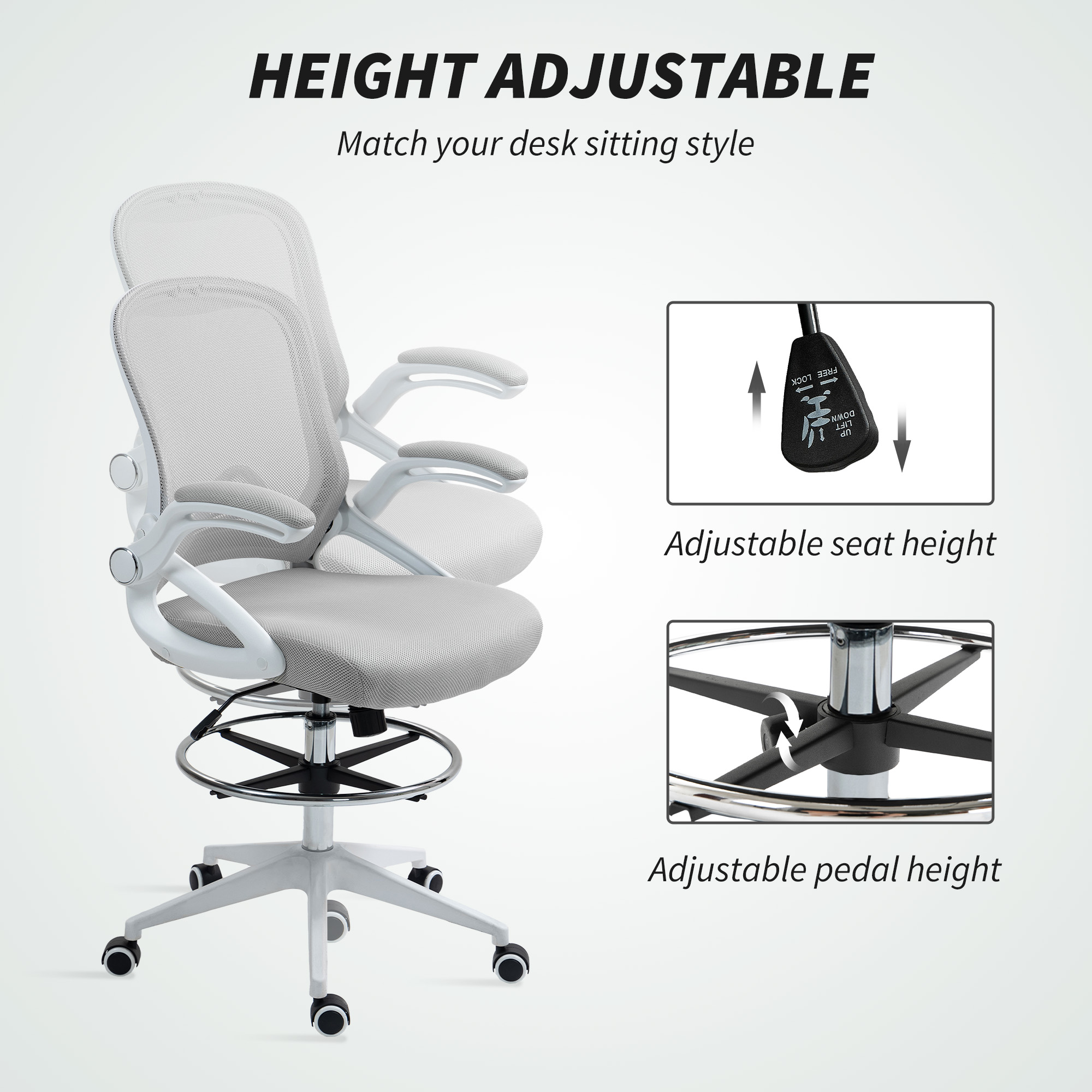 A quality chair must be comfortable even after sitting for long periods. The comfort of this Vinsetto draughtsman chair is achieved through breathable mesh material for the back, solid base casters and a fully adjustable chair body. The mesh chair's seat, armrest and footrest height are designed to fit your sitting style and ensure productivity. Make the most out of your office time with this drafting office chair from Vinsetto.