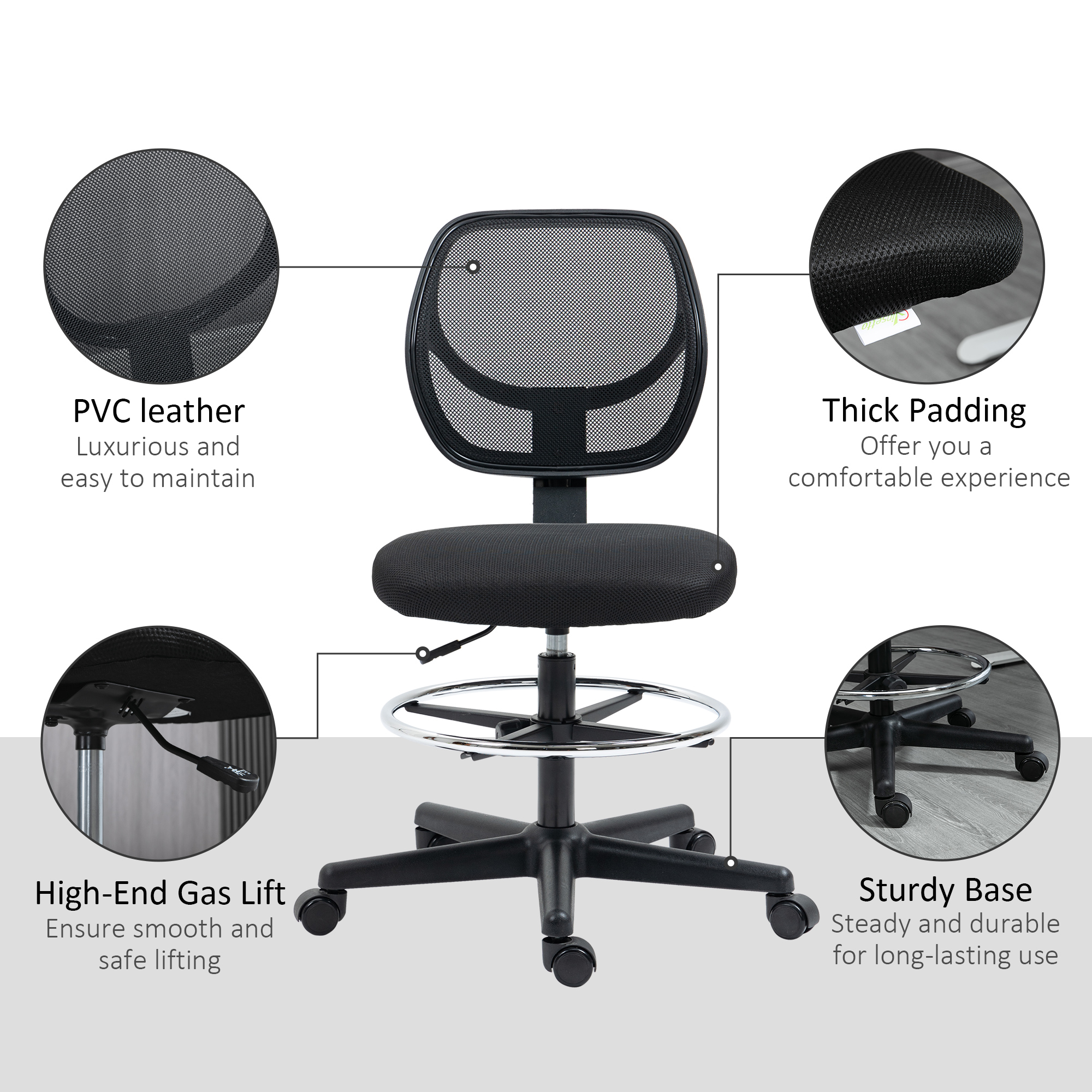 This drafting stool chair, from Vinseto, comes in a draughtsman design - great for working at higher levels. Adjust the height between 50-70cm easily, thanks to the under-seat lever. The padded seat, curved mesh back and five-wheeled base make the painting chair a pleasure to sit on and use, supporting you as you work. Adjust the bottom bar to rest your lower body comfortably. Tall surfaces? No problem!