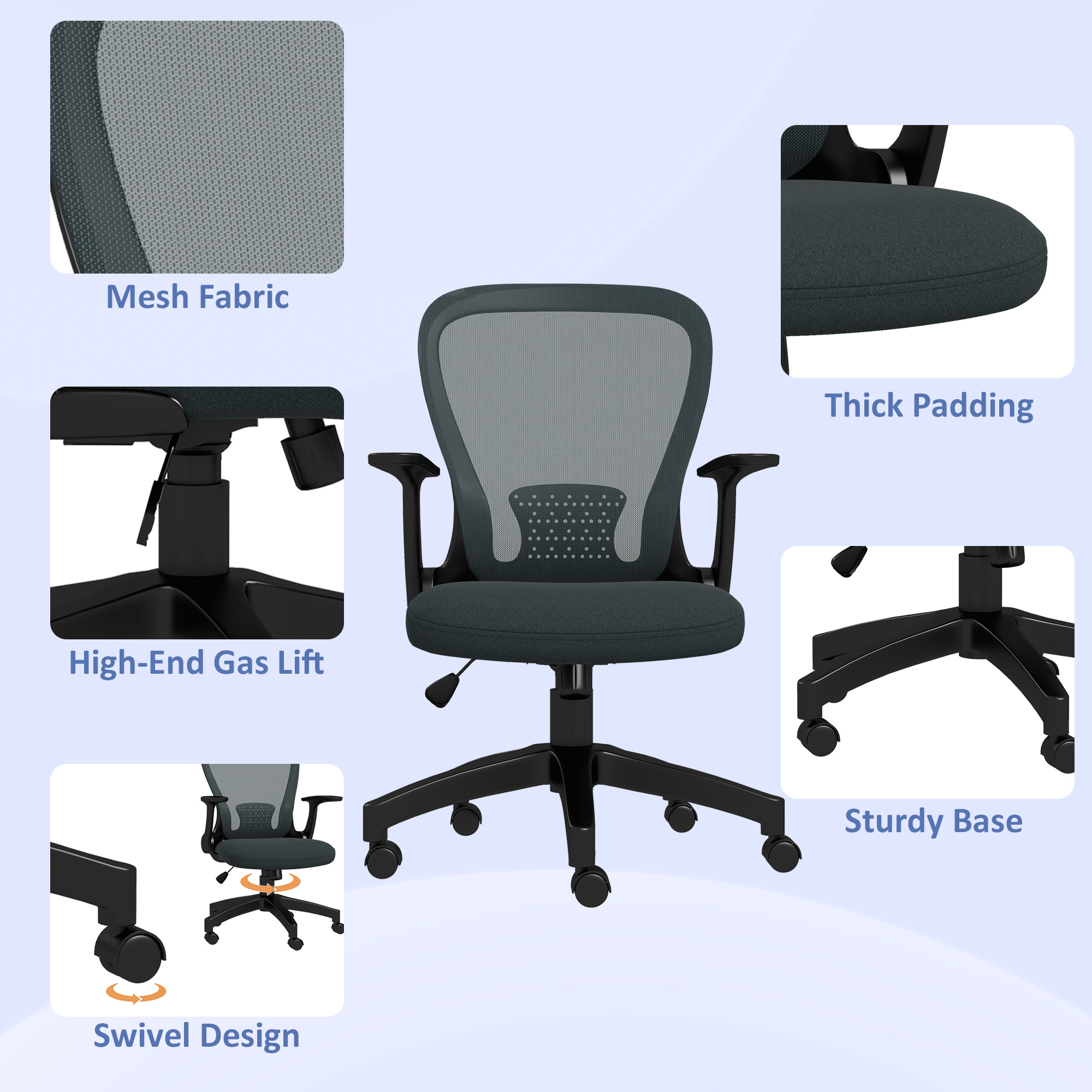 - Flip-up armrests to push completly under desk