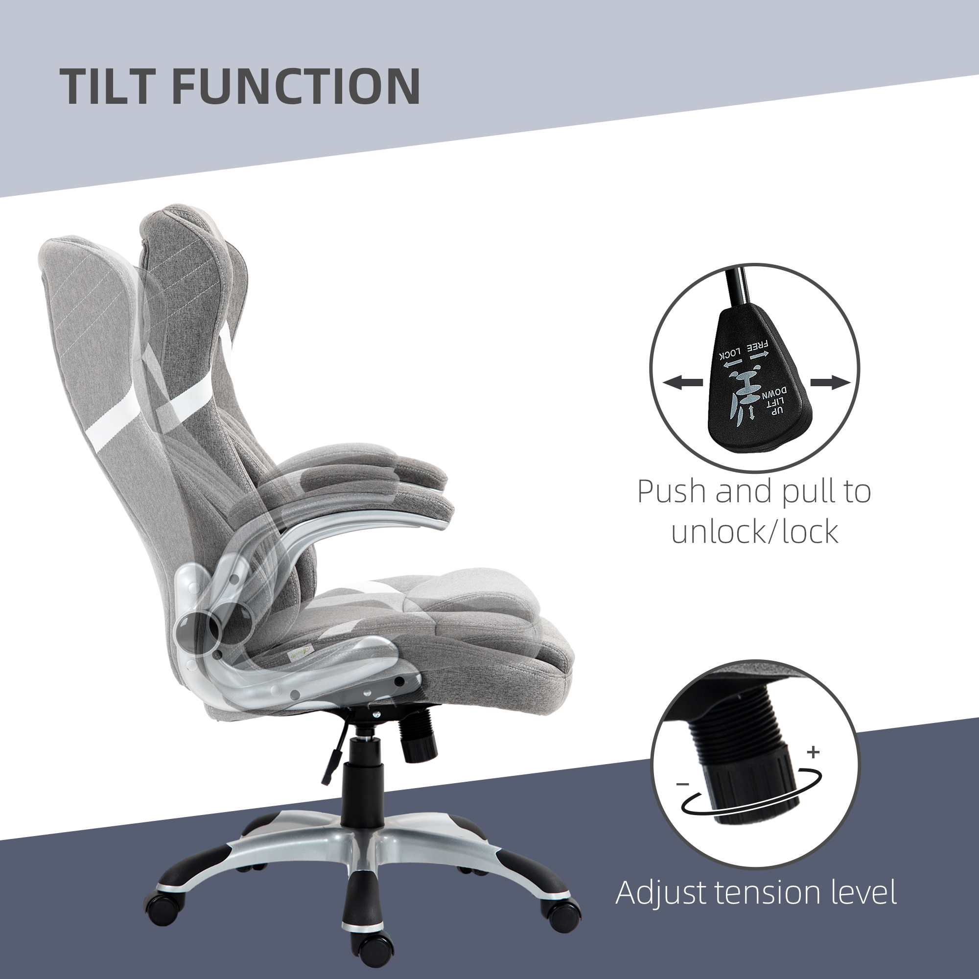 A simple, comfortable chair to make your work days as easy as possible. This Vinsetto piece comes filled with soft sponge, and is wrapped in linen-look upholstery for a softly smooth piece. Adjust the height between 44-52cm and find a level you like best. It comes with an adjustable tension knob - set the back to an angle which supports you best. Complete with five wheels, this swivel chair is easy to roll around on the floor, at all times.
