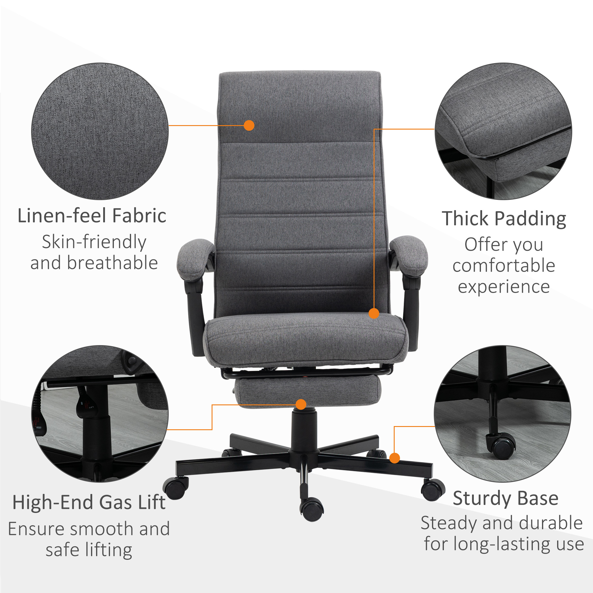 A home office chair, from Vinsetto - use this to get on with your work, wherever you are. A tall back, which is extra padded at the bottom for extra support, reclines back to a maximum 135°; paired with the manual footrest, gives a comfortable spot to rest and take time out. Other ergonomic features include the full-swivel seat, tall back and armrests. Complete with a wheeled base, this comfy chair moves around easily.