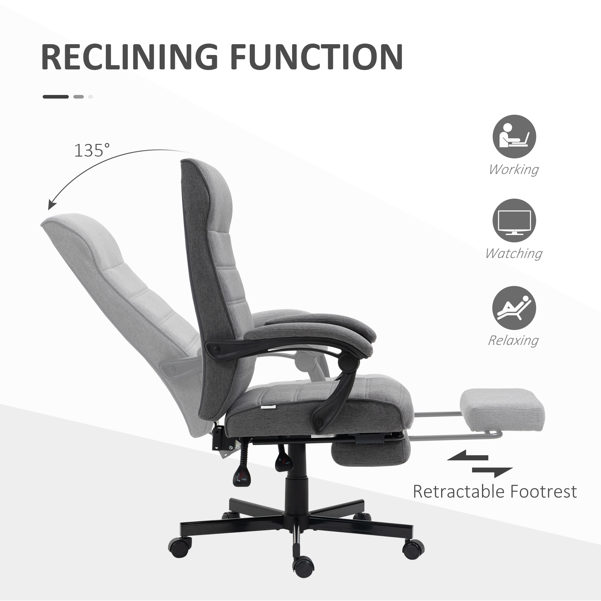 Features: - Reclining function: lock the back to any angle, maximum 135°. Manual footrest also - great for relaxing