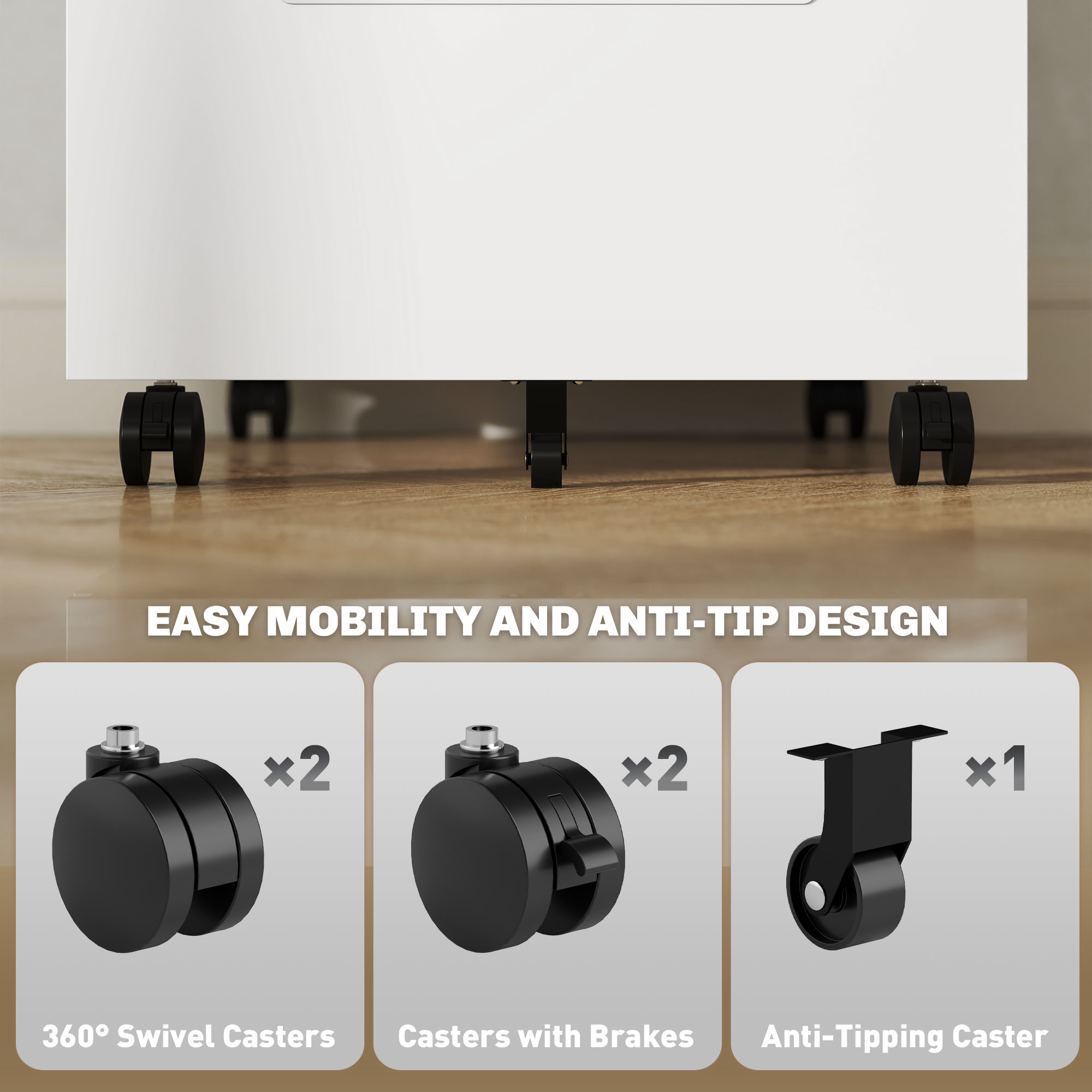 - A middle caster prevents tipping for safety