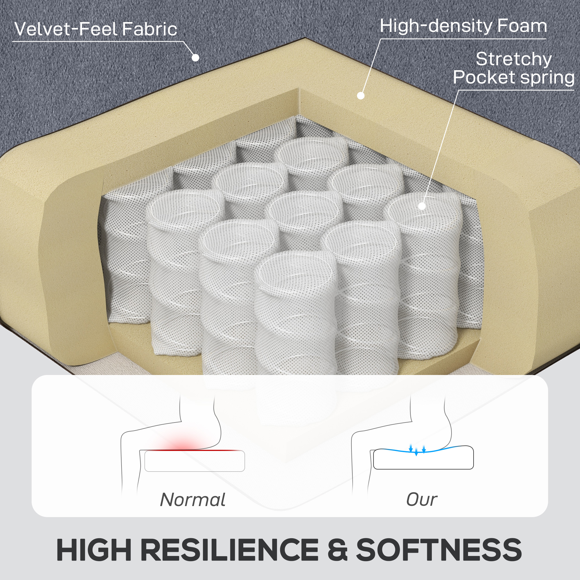 - Thick foam padding and pocket springs for comfort and support