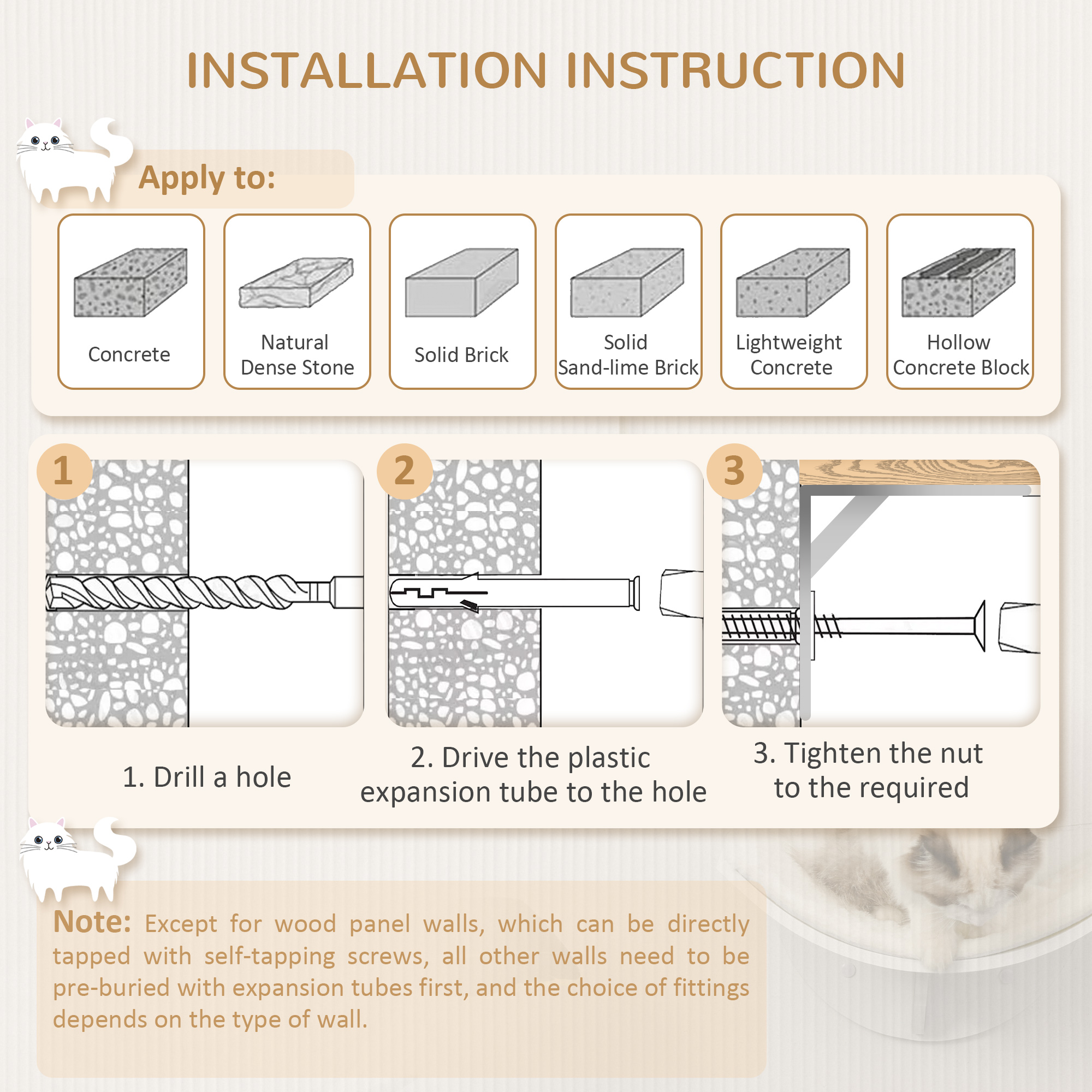 Rattle up your pet's thirst for curiosity and adventure with this cat wall shelves from PawHut. Made from MDF which steadily holds up to 4. 5 kg in weight, this cat wall bed is crafted into a curved design to allow them to rest peacefully and prevent them from falling off, with a Berber fleece covering for comfort and warmth. Wall mountable in design thanks to the attachment board below the shelf, it comes complete with all the required accessories to set up.